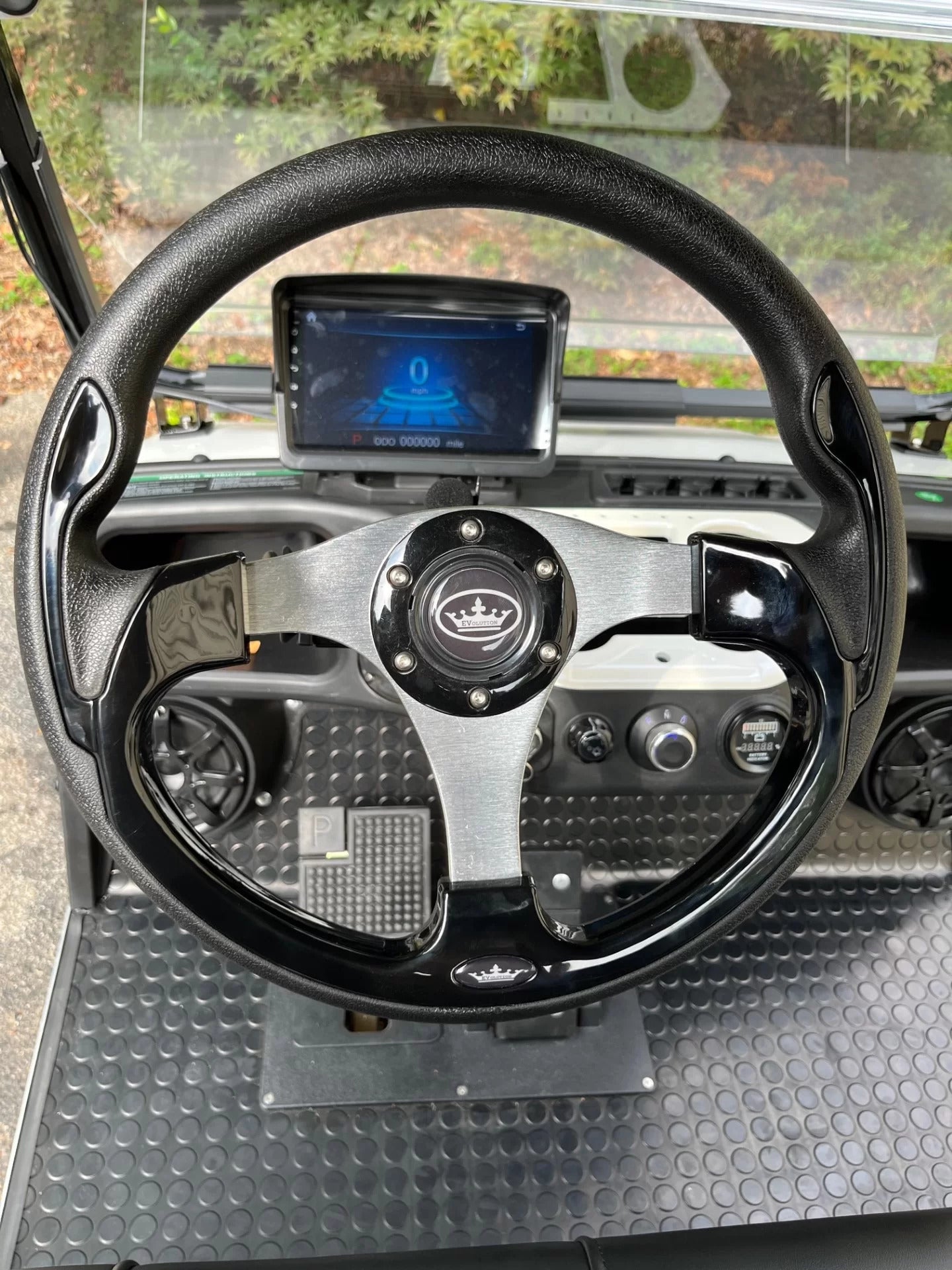 Key equipment includes 14-inch wheels and tires, AM/FM radio, Bluetooth connectivity, 6.5” floor speakers, four-wheel disc brakes, backup camera, and LED lighting. The cart is capable of speeds up to 25 mph depending on conditions, making it suitable for residential neighborhoods, gated communities, resorts, and private properties.